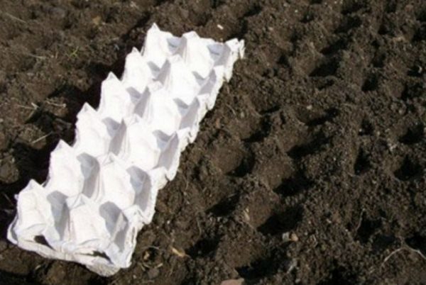 - بزار من وعاء البيض - الطريقة الأصلية والسهلة. مزايا الطريقة هي البساطة والبذور المزروعة بالتساوي على المسافة المطلوبة. للقيام بذلك ، اضغط على صينية في الأرض وصب المواد الزراعية من 1 أو 2 البذور في الثقوب الناتجة.
