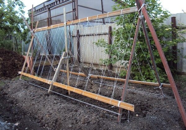 مع يديك ، من السهل تركيب وتوتر شبكة تعريشة في دفيئة. كما يدعم على نهايات الدفيئة تعيين أعمدة ارتفاع شعاع 2 متر إلى حجم الشبكة. يعتمد ارتفاع الهيكل على حجم الاحتباس الحراري. على طول السرير من 5-6 م تحتاج إلى وضع 3 الدعائم الوسيطة إضافية. إذا تم التخطيط لبناء قابلة لإعادة الاستخدام ، فمن الأفضل تثبيت رفوف خشبية في أقسام من أنابيب معدنية محفورة في الأرض. هذا الإجراء سوف يحمي الشجرة من التعفن.