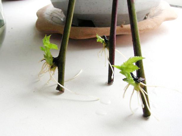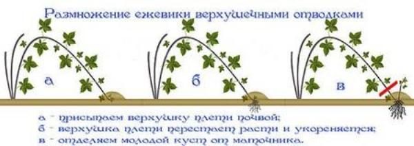 - корен процес, През пролетта на нови издънки, нарастващи от корените, се развиват на повърхността. В същото време връзката с майчиния храст не се губи. Зелените издънки са изкопани от май до юни. Изкопайте ги с бучка земя и трансплантирайте на ново място. Височината на изкопаните издънки трябва да бъде от 10 см. Останалите леторасти се отстраняват най-добре при разхлабване на почвата.