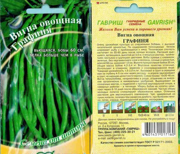 - Gräfin - frühe produktive Qualität. Die ersten Früchte können 65 Tage nach dem Beginn der Massentriebe gesammelt werden. Die Liana wickelt sich bis zu 3 m, die Bohnen sind 50 cm lang. Empfindliche Hülsen enthalten keine Fasern. Samen sind schwarz. Auf einem Quadratmeter Bett werden bis zu 2,5 kg Getreide gesammelt.