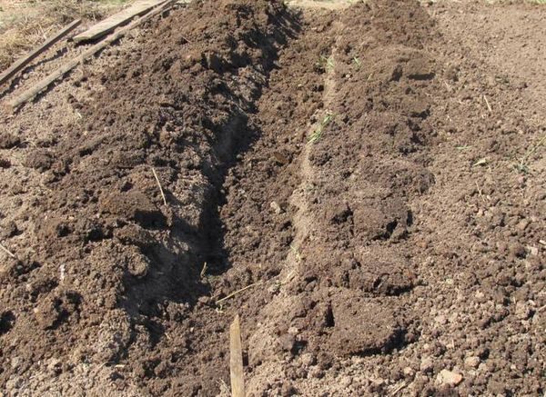 - Landung unter dem Graben. Geeignet für sandige Böden. Im Herbst sollte der Graben 30: 100 cm ausgehoben werden, in einem 15 cm langen Graben sollte eine Heuschicht angelegt und mit Asche gemischtem Dünger gedüngt werden. Während der Frostperiode wird die Schicht verdichtet. Im Frühjahr wird Pflanzgut in einen Graben gelegt und leicht mit Erde besprüht.