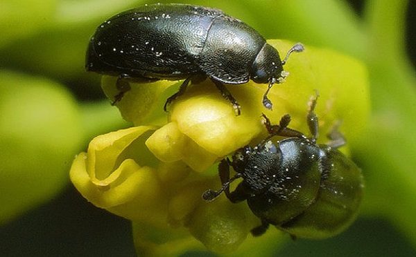 Ein kleiner Käfer (Körperlänge nicht mehr als 2,5 mm) von schwarzer Farbe mit blauem Farbton verträgt Frost in Pflanzenresten hervorragend. Im Frühjahr wird aktiviert, Eier in ungeblühten Knospen legen.