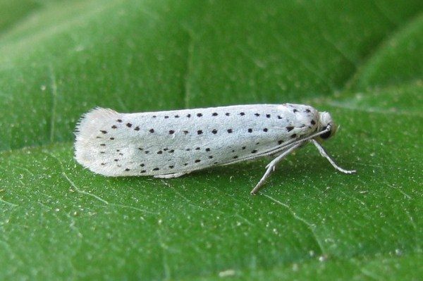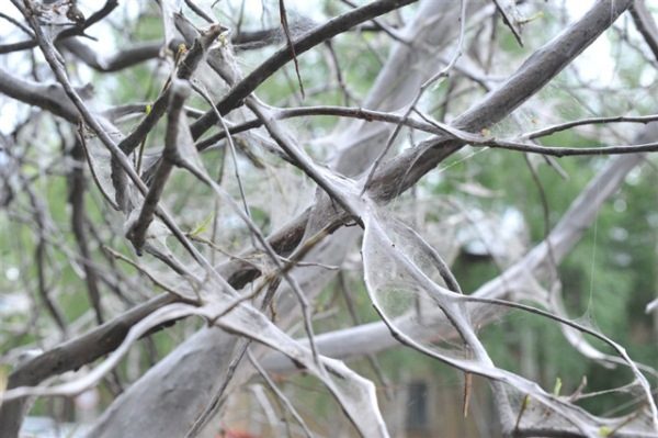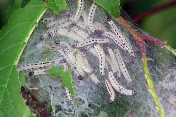 Einige Raupen der gleichen Weißdornmotte weben eigentümliche Blattnester, in denen sie leben und fressen.