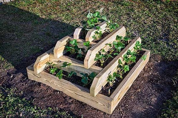 Die Rippen, die sich in Form einer hohen Pyramide befinden, werden unterschiedlich als Stufen bezeichnet. Die Pflanzung junger Pflanzen erfolgt übereinander. Obwohl der Entwurf eine kleine Fläche einnimmt, kann eine große Anzahl von Erdbeeren darauf gepflanzt werden.