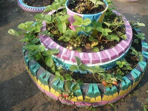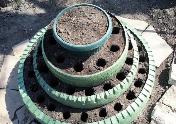 Die Spitze des Designs wird ein Autoreifen sein. Sie müssen Löcher vorbereiten, und die Basis ist mit Erde gefüllt. Reifen müssen übereinander gestapelt werden. Als Nächstes folgt das Auffüllen des Landes, das Sie zuvor benötigen gut zu düngen. Durch seine eigene Massenstruktur wird nachhaltig. Löcher werden von der Seite des Autoreifens gemacht.
