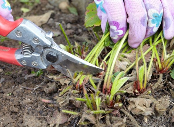 Beschneiden produzieren Gartenschere, wenn die Erdbeerbetten nicht groß sind. Wenn die Größe der Beerenplantagen die Fähigkeit zur manuellen Verarbeitung übersteigt, Trimmvorgang hilft, einen elektrischen Trimmer oder Gasmäher auszuführen.