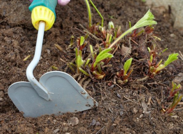 - Lockerung des Bodens unter den Büschen von Gartenerdbeeren