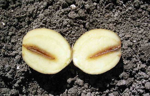 - η σοδειά συγκομίζεται μπροστά από το χρόνο, ο πολτός σκουραίνει στην άγουρη πατάτα. Οι υπερβολικές πατάτες, κατά τη διάρκεια της θερμότητας, ενδέχεται να επιδεινωθούν όταν αποθηκεύονται σε υπερθερμασμένο χώρο.