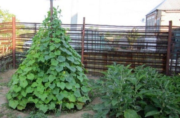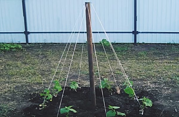 Ένας στύλος σφυρήλατο κοντά σε κάθε φυτό, στον οποίο θα συνδέεται ένας σπάγκος. Μια υψηλή στήριξη σφυροκοπείται στο κέντρο του κύκλου - είτε πρόκειται για μεταλλικό σωλήνα είτε για ξύλινη σφήνα. Για τους επόμενους γαρνιτούρες αγγουριού, τα άγκιστρα κρεμασμένα στο τέλος του στηρίγματος αν χρησιμοποιηθεί μεταλλικός σωλήνας ή ένα σφυρήλατο καρφί στην περίπτωση ενός ξύλινου στύλου.