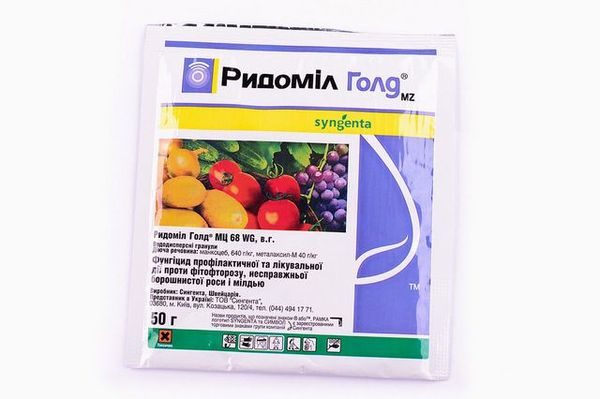 - Ridomil Gold. Προστατεύει τις ντομάτες από το εξωτερικό και εμποδίζει τη διείσδυση μυκήτων στους ιστούς. Για την προετοιμασία αυτής της λύσης, πρέπει να πάρετε 10 γραμμάρια του προϊόντος και να το αραιώσετε σε 4 λίτρα νερού. Αρχίζουν να μεταποιούν τα φυτά κατά τη διάρκεια της καλλιεργητικής περιόδου και στη συνέχεια επαναλαμβάνουν κάθε μισό μήνα.