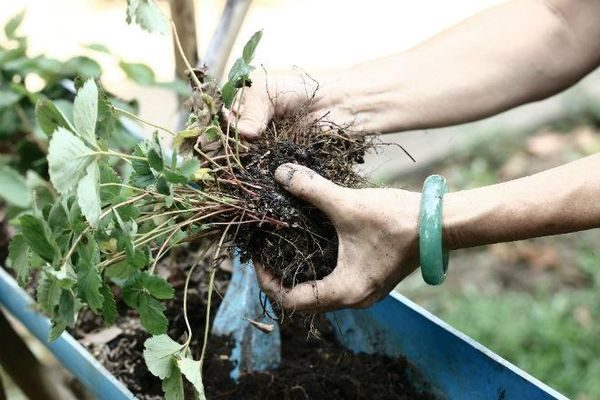 - Προετοιμάστε το μίγμα εδάφους με ανάμιξη ίσων μερών τύρφης και χώματος κήπου. Το μίγμα γονιμοποιείται με χούμο. Μπορείτε επίσης να χρησιμοποιήσετε έτοιμο χώμα για φράουλες.