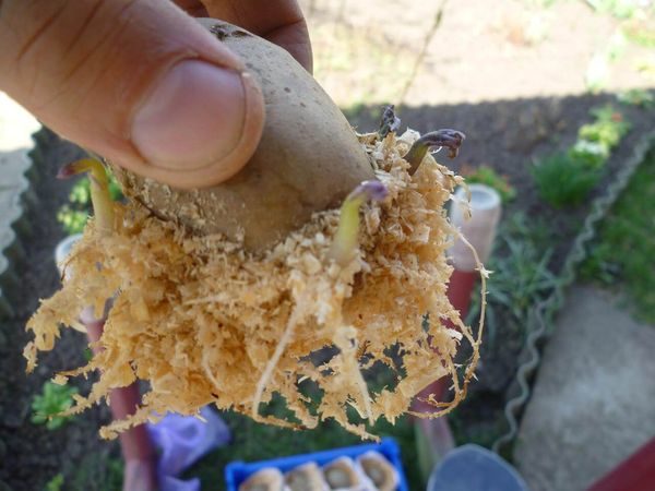 - In the feed boxes. Heat the seeds in the oven or oven to neutralize them from pests. Fertilize minerals and organic matter, laying it on the bottom of the boxes. Tubers lay out several layers and slightly moisten with water. Leave until sprouting in the room at a temperature of +15 degrees.