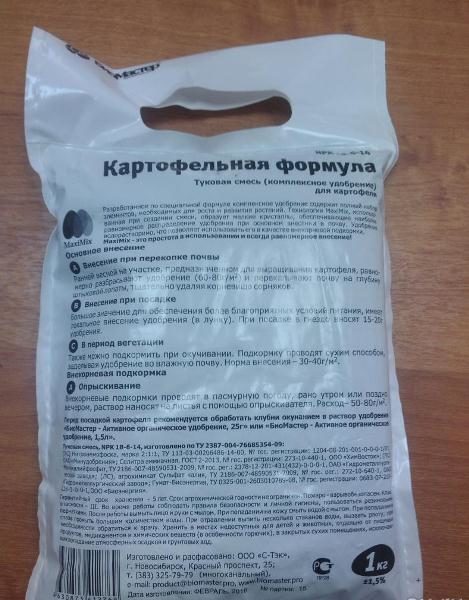 Potato formula Available in small white bags of one, two and a half, or five kilograms. The preparation contains such minerals as phosphorus, nitrogen and potassium. Available in the form of granules. This allows you to make the drug in a dry form, and dilute it with water. This fact should be noted: thanks to him, the range of application of fertilizer is greatly expanded.