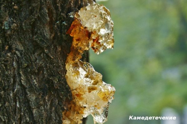 - Comedication - the bark of the tree is strongly exuded and sticky amber-colored liquid begins to ooze from it.