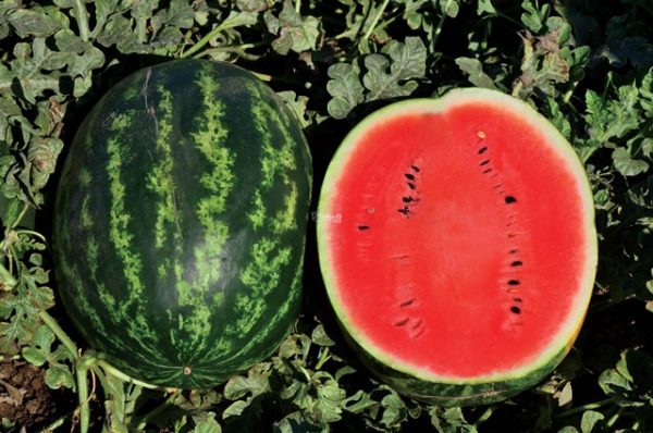 Vegetative period - 58-62 days, average berry weight is 7-8 kg. A covering material is used to ensure the conditions of rapid maturation. Large leaves and spreading of the stem prevents the root system from sunburn. The hybrid is appreciated due to its high sugar content and dense, but delicate structure of red flesh.