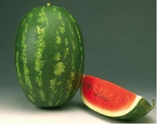 The variety belongs to early ripening species, the fruit ripens in just 65 days. The shape of the berry is elongated, striped color with alternating dark green and yellowish tones. On average, watermelon curls 12-14 kg. The red flesh is very juicy and tender with a high sugar content.