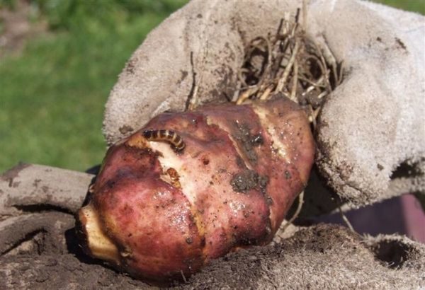 Abitazione nel suolo colpisce radici e tuberi le piante Le sue larve passano attraverso il tubero, facendo mosse, provocando così spesso il decadimento. A causa del colore brillante, le larve vengono facilmente rilevate durante lo scavo del terreno.