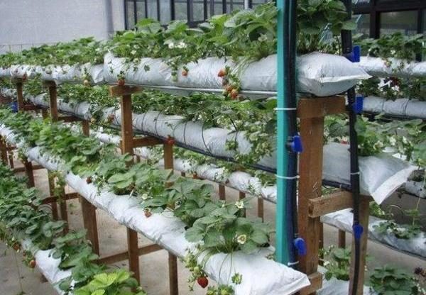 - Fragole in crescita in sacchetti in modo orizzontale