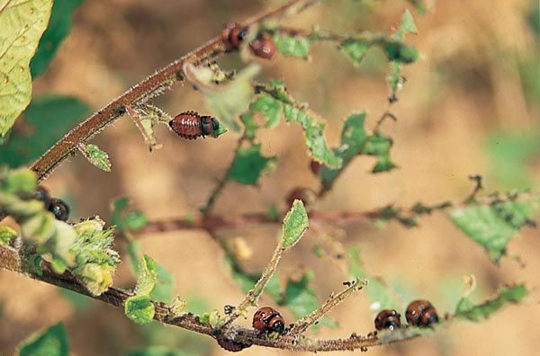 Les larves sont beaucoup plus voraces que les adultes.. Ils peuvent complètement détruire toutes les pousses.Lorsque toutes les feuilles sont mangées et non entières, elles sont envoyées pour manger de la pulpe de feuilles, ce qui entraîne la destruction complète de la plante.