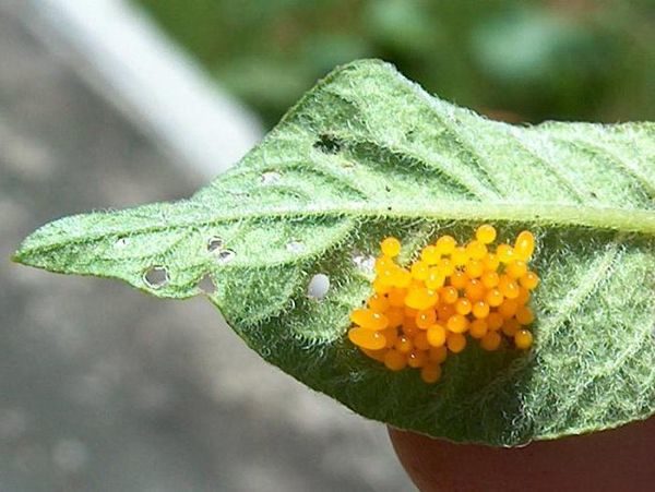 - L'œuf. Les insectes laissent leurs œufs sur les feuilles.En règle générale, la femelle pond environ mille œufs, de forme ovale et d’une taille proche de deux millimètres. Peut-être au stade de l'oeuf de cinq à dix-sept jours, cela dépend des conditions extérieures. Pendant cette période, les individus acquièrent un ton plus sombre.