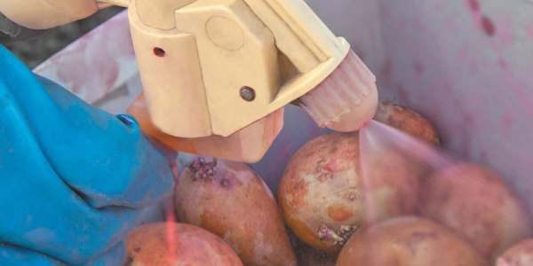 Pour préparer le matériel de plantation, il est nécessaire d’étaler d’abord les pommes de terre sur une pellicule de plastique et de traiter les tubercules avec un pistolet pulvérisateur ou un pulvérisateur.
