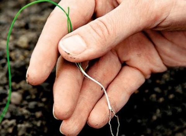Chaque racine, avant d'être traitée dans le sol, est traitée par un locuteur spécial, qui est préparé à partir d'argile, de fumier et d'eau (tous les composants sont pris dans des proportions égales). Pousses trop longues raccourci à 4 cm. Les semis du sol sont saupoudrés en petites quantités. Le travail de transplantation se termine par un arrosage abondant.