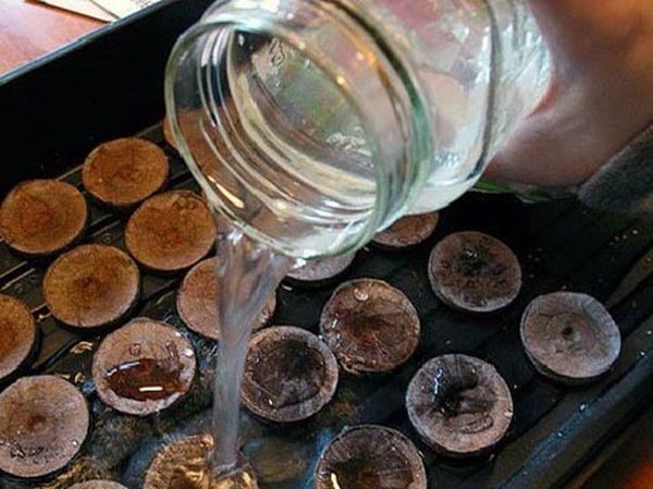 - les coupelles en tourbe sont placées dans un récipient à parois basses, rempli d'eau;