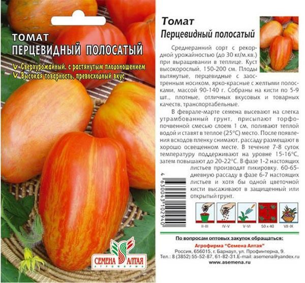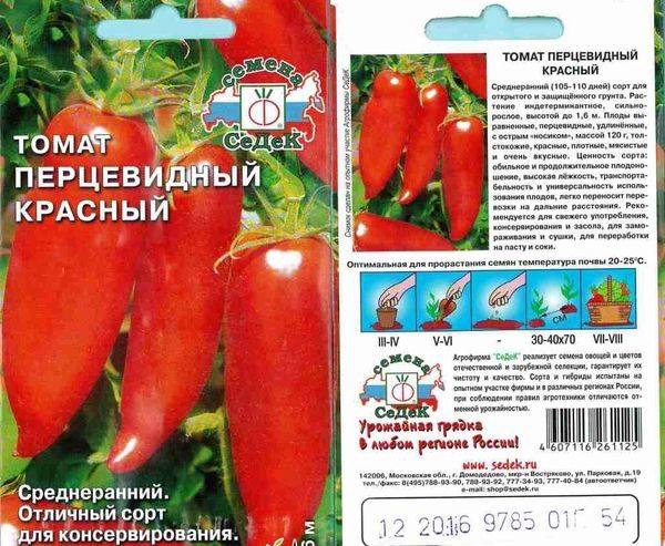 Tomate hybride Pertsevidny élevé sur la base d'une variété de crème. Les tomates ont une forme allongée, ressemblant beaucoup à des poivrons. Leur couleur varie selon la marque.Il peut être rouge, jaune, orange, etc.