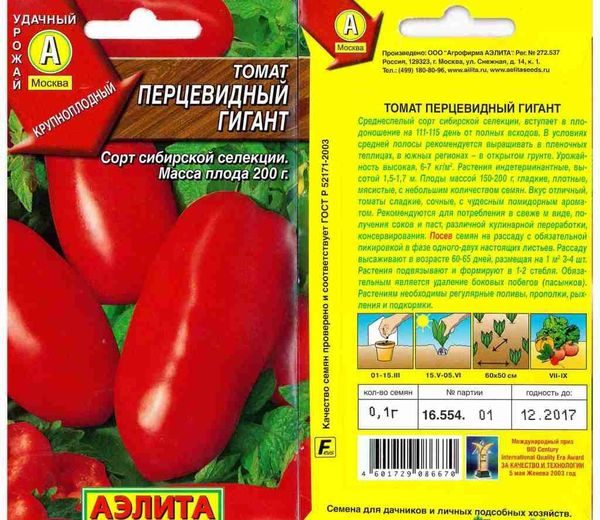 Pour obtenir une tomate plantée de grande taille Géant du poivre, la masse de fruits qui atteint 250 gr. et plus. Cette variété a été créée par les éleveurs Mikhail Gilev et Zoya Shott. Dans notre pays, il est cultivé depuis 2007.
