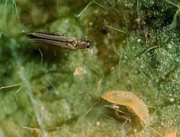 Insecte microscopique (environ 1 mm), d’apparence semblable à un papillon. Il se nourrit de la sève des plantes, perturbant le mouvement des nutriments à travers les vaisseaux. À la suite de l’invasion de parasites, la culture est d’abord recouverte de petites taches argentées, qui se développent et se fondent les unes dans les autres.