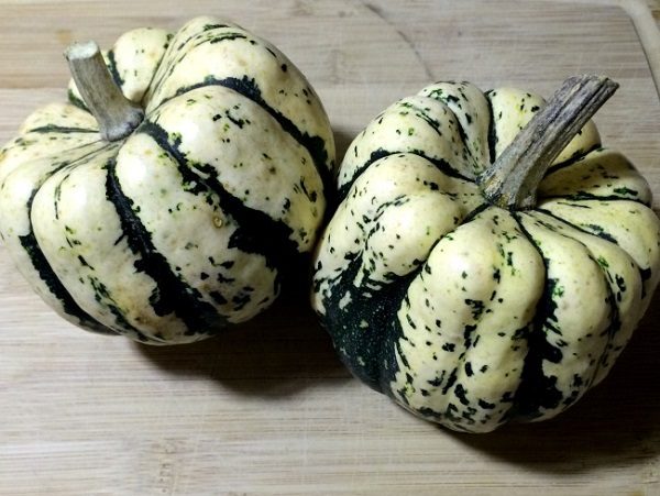 - "Sweet Dumpling". Poids des fruits - 500 gr. Les espaces entre les segments jaune clair sont remplis de bandes vert foncé avec des taches blanches.
