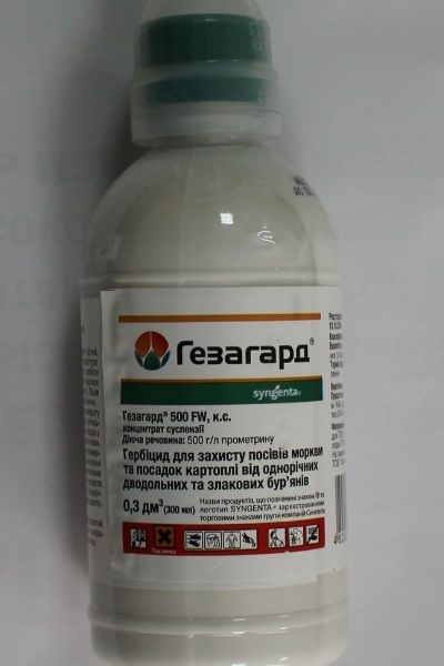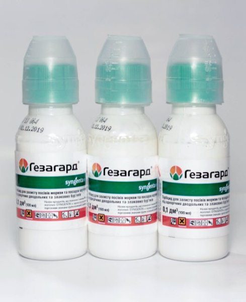 Droga Gezagard usado para proteger o jardim contra ervas daninhas. Este herbicida lida perfeitamente com a remoção de plantas daninhas que afetam o crescimento das culturas de raízes.