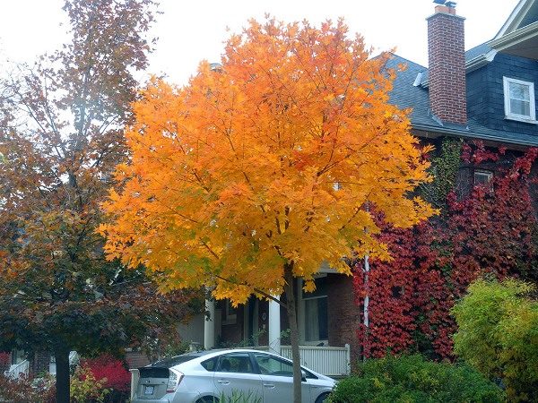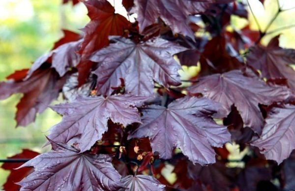 L'érable le plus populaire Canadien, Platanovidny, érable Nervotny avec feuillage de Bourgogne. Ils sont excellents en solo dans la pelouse ouverte, bons dans les compositions et sur le fond des haies.