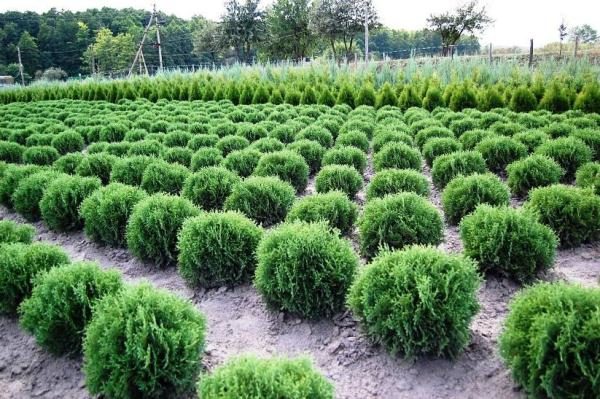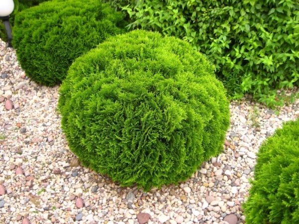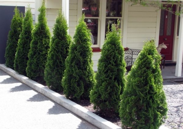 En pépinière, vous pouvez choisir des variétés de formes pyramidales, ellipsoïdes ou sphériques. Le mur de jardin de thuya planté d'une ligne lisse semble très intéressant. Cela vous permet de battre exceptionnellement même le chalet d'été standard.