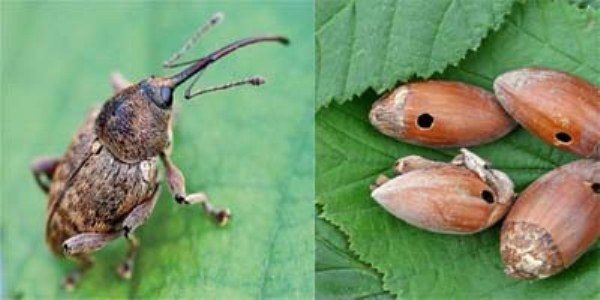 Les chenilles des fruits endommagés se sont répandues en grande quantité. Un insecte nuisible est le charançon. Quand le printemps arrive, il mange les feuilles, puis pond des œufs. Une larve apparaît à l'intérieur de la noix, qui ronge tout le contenu. Dans la lutte contre les parasites, il est nécessaire de vaporiser les arbustes après la floraison avec une solution de chlorophos ou d’autres médicaments. Des mesures sont prises pour nettoyer le feuillage et les noix endommagées près de l'arbre.