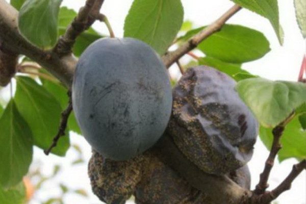Monilioz (pourriture grise) - un champignon qui gâche les fruits des prunes. Cela ressemble au stade initial, à une tache brune sur la peau. Cette formation se développe rapidement et est recouverte d'un "duvet" gris, porteur des spores du champignon.