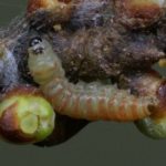 Bektaşi üzümü ateş iğnesi daha sonra olgunlaşmamış olan meyvelerin kümeleri üzerinde üzümü beyaz örümcek ağları üzerinde bırakır.