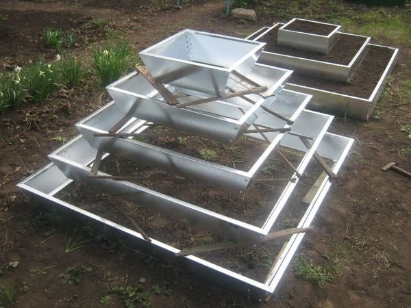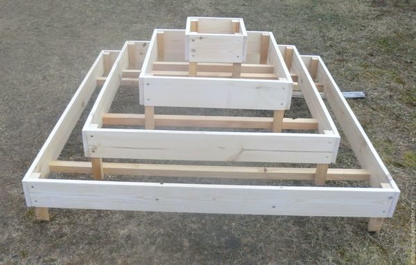 Baz altında tavsiye edilir ağ örgüsü açmakPiramidi mollerden korumak için. Her kademe monte edilirken sabitlenir, ekim için hazırlanan toprak kompozisyonu doldurulur.