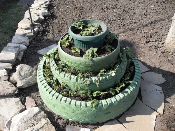 Kullanarak bir yuvarlak çilek piramidi yapabilirsiniz farklı çapta eski araba lastikleri. Daha düşük seviye için, ağır vasıtaların tekerleğinden en iyi şekilde, aşağıdaki seviyeler kademeli olarak azaltılır. Toprak katmanlarının genişliği, meyve çalılarının dikilmesine izin vermelidir.